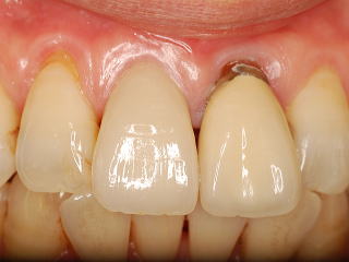 前歯で金属冠の前面にプラスチックを白く貼り付けたもの | 1 白いが自然な透明感にややかける場合がある 2 裏の金属の部分は咬み合わせに対し十分な強度があるが、プラスチックの部分は弱く破折や剥離あるいは摩耗が生じる場合がある 3 経年変化で変色が生じる |